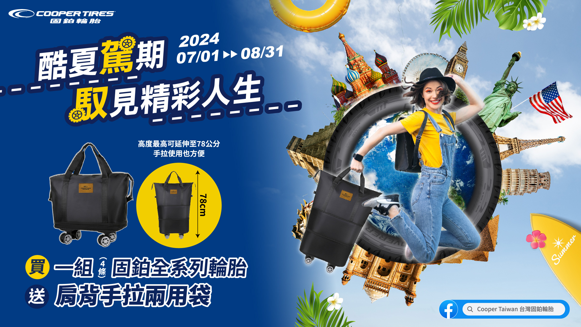 瞭解詳情自2024年7月1日至8月31日止,購買一組(四條)固鉑全系列輪胎,即可獲得「肩背手拉兩用袋」。外型簡約時尚,還可擴充大容量,旅行途中,再多的東西都裝得下!
